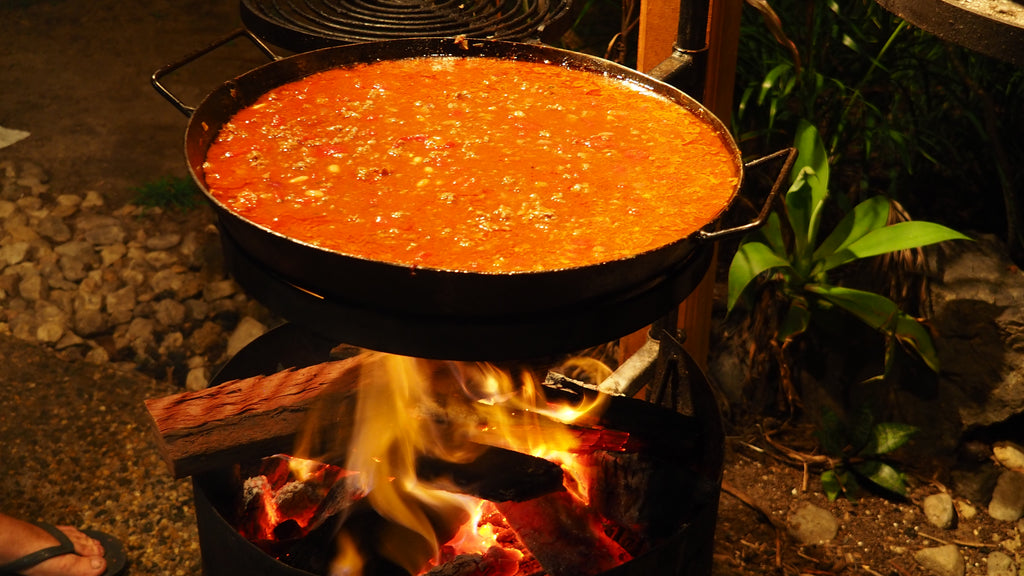 The ACK BBQ PAN works with all the AUSSIE CAMPFIRE KITCHENS GEAR sitting on the Swinging or Folding Grills or we have a specially designed BBQ PAN CRADLE & works with any of our ACK FIRE PITS.
