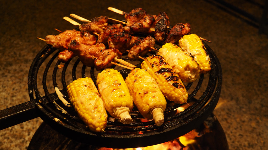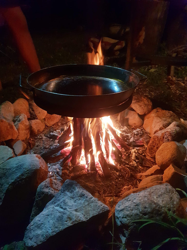 The ACK BBQ PAN works with all the AUSSIE CAMPFIRE KITCHENS GEAR sitting on the Swinging or Folding Grills or the purpose-built