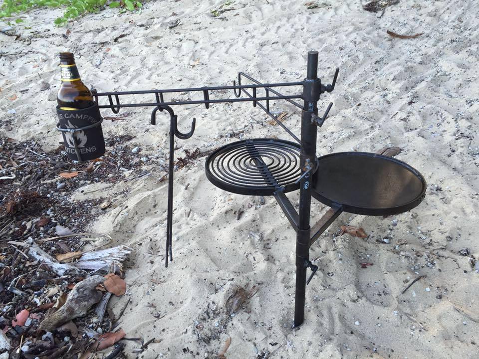 Swinging Plate & Grill with Camp Oven Hook, Utensil Rack & Drink Holder